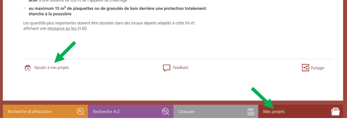 Vous vous intéressez, par exemple, aux distances de sécurité incendie pour un bâtiment administratif. Sélectionnez l'affectation « Bureau », ensuite « max. 2 étages », puis « Distances de sécurité incendie ». Par la suite, vous souhaitez également en savoir plus sur les prescriptions relatives aux extincteurs. Afin de ne pas devoir passer à nouveau par toutes les rubriques, voyez la piste de navigation en haut de page: Page d'accueil > Recherche d'affectation > Bâtiments administratifs > max. 2 étages > Distances de sécurité incendie